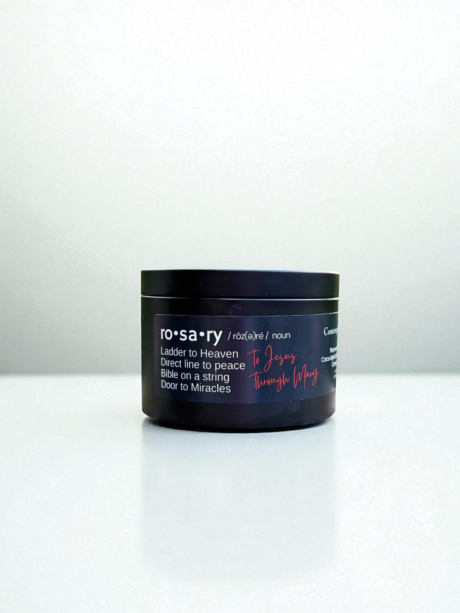 Our Rosary candle has a fruit forward scent that is warm and always inviting. With bright citrus and a touch of black cherry enhancing the dark plum heart of this fragrance. Amber, sugar, and vanilla base notes reinforce the sweetness of this scent, while musk and freesia add a light earthy dimension.